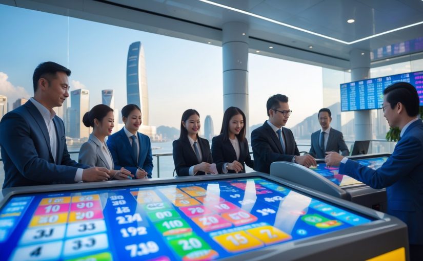 Orang-orang di kantor lotere modern di Macau dengan layar digital menampilkan angka dan hadiah, latar belakang menampilkan pemandangan kota Macau.