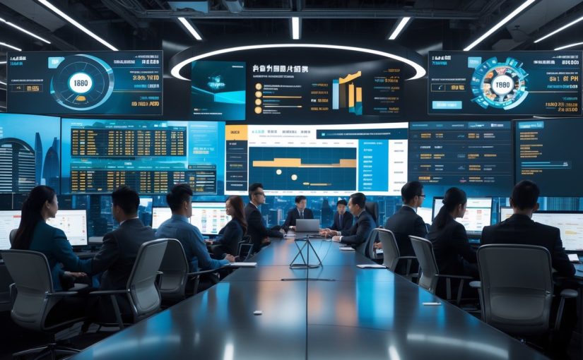 Sejumlah profesional bekerja di kantor modern dengan layar besar menampilkan grafik dan jadwal taruhan terkait Macau.