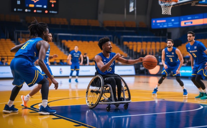 Seorang atlet kursi roda bermain bola basket bersama timnya di lapangan dalam pertandingan yang sedang berlangsung.