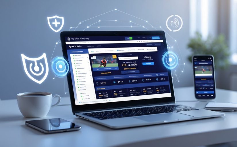 Sebuah ruang kerja modern dengan laptop dan ponsel yang menampilkan antarmuka situs taruhan olahraga online, dilengkapi dengan elemen yang menunjukkan kecepatan dan keamanan.