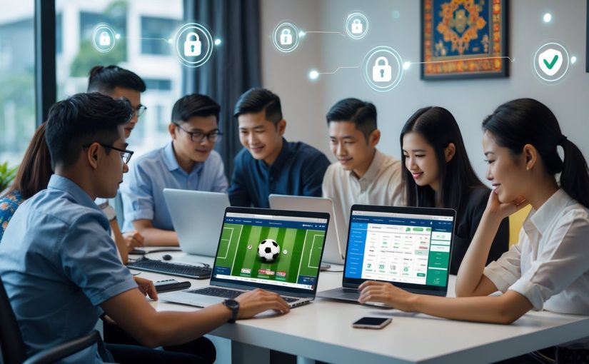 Sekelompok orang muda menggunakan laptop dan ponsel di ruang kantor modern dengan elemen budaya Indonesia, fokus pada aktivitas taruhan olahraga online yang aman dan terpercaya.