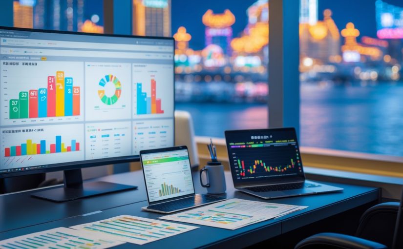 Sebuah kantor modern dengan monitor komputer menampilkan grafik dan data analisis taruhan, dengan latar belakang pemandangan kota Macau.