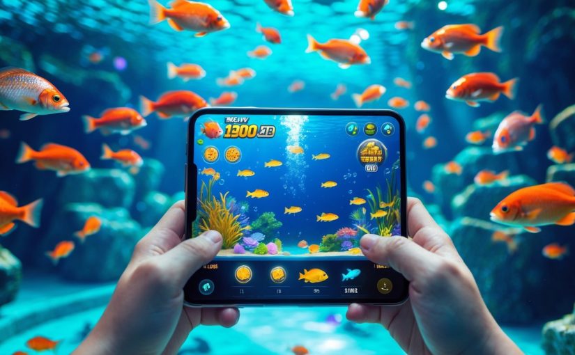 Layar perangkat digital menampilkan permainan menembak ikan dengan latar bawah laut penuh ikan berwarna-warni.